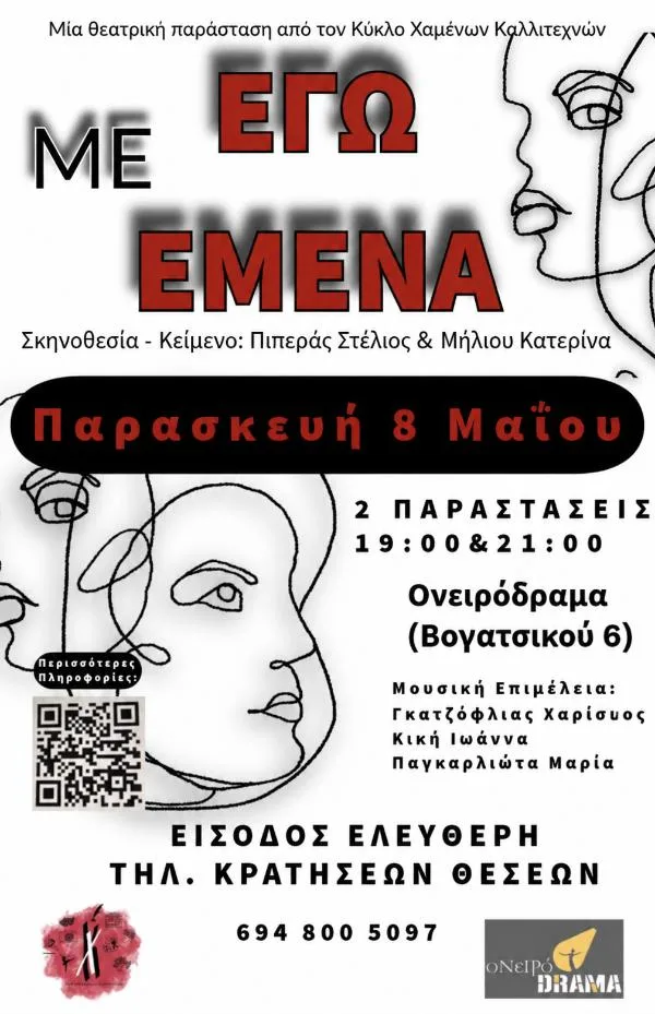 Η ομάδα εφήβων «Κύκλος Χαμένων Καλλιτεχνών» κάνει το δυναμικό της ξεκίνημα και παρουσιάζει την πρώτη της θεατρική παράσταση με τίτλο «Εγώ με εμένα», την Παρασκευή 8 Μαΐου, στη σκηνή του Θεάτρου «Ονειρόδραμα» (Βογατσικού 6, Κοζάνη).