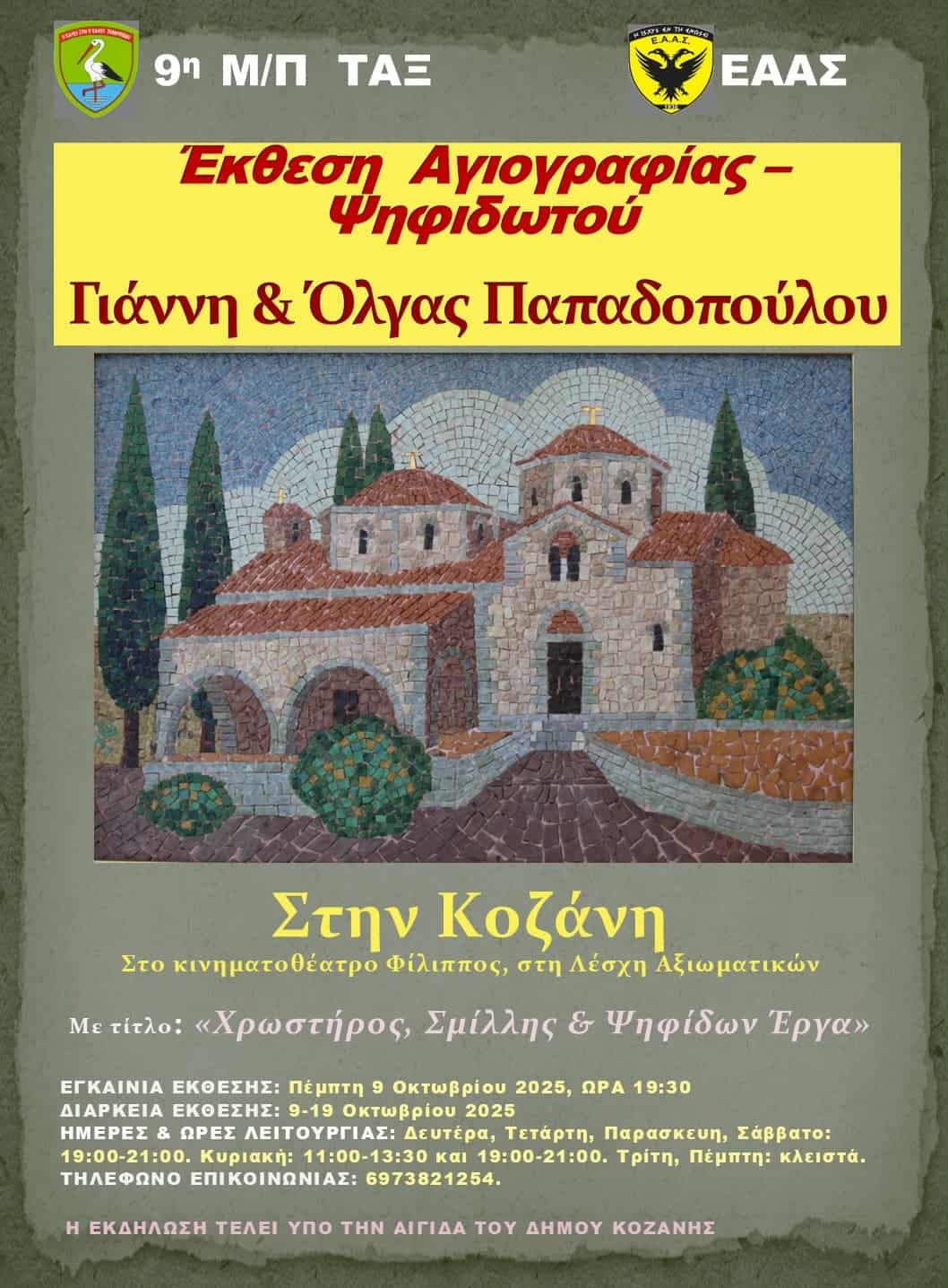 Μια ιδιαίτερη έκθεση που συνδυάζει την τέχνη της αγιογραφίας και του ψηφιδωτού παρουσιάζεται στην Κοζάνη από την Πέμπτη 9 Οκτωβρίου 2025. Οι δημιουργοί Γιάννης και Όλγα Παπαδοπούλου εκθέτουν έργα τους υπό τον τίτλο «Χρωστήρος, Σμίλης & Ψηφίδων Έργα», στο κινηματοθέατρο «Φίλιππος», στη Λέσχη Αξιωματικών.