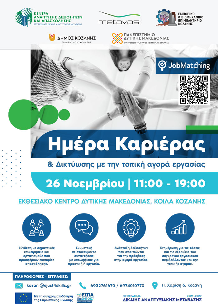 διαβάστε σχετικά: Ημέρα Καριέρας & Δικτύωσης με την τοπική αγορά εργασίας στην Κοζάνη – Δεκάδες θέσεις εργασίας και επιμορφωτικά workshops