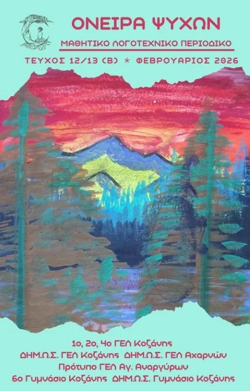 Το περιοδικό «ΟΝΕΙΡΑ ΨΥΧΩΝ» (Βραβείο Γυναικείας Λογοτεχνικής Συντροφιάς, 2021), μια πρωτοπόρα συνεργατική προσπάθεια του 1ου, 2ου, 4ου ΓΕΛ Κοζάνης, του ΔΗΜ.Ω.Σ. ΓΕΛ Κοζάνης, του ΔΗΜ.Ω.Σ. ΓΕΛ Αχαρνών, του 6ου Γυμνασίου Κοζάνης, του ΔΗΜ.Ω.Σ. Γυμνασίου Κοζάνης και του Πρότυπου ΓΕΛ Αγ. Αναργύρων Αττικής, έχει τη χαρά να ανακοινώσει την εκτύπωση του νέου διπλού τεύχους 12-13, το οποίο κυκλοφορεί σε δύο μέρη. Ποιήματα και διηγήματα στα ελληνικά, τα αγγλικά, ακόμη και στα… ποντιακά, άρθρα για διάφορα ζητήματα (bullying, παιδεία, τσιγάρο, ρατσισμό, ενδοοικογενειακή βία, Ιστορία, τουρισμό, ταξίδια, άγχος, προσφυγιά, μέσα κοινωνικής δικτύωσης, ψυχική υγεία), βιβλιοπαρουσιάσεις, συνεντεύξεις με ανθρώπους της Κοζάνης (με τον συγγραφέα Μιχάλη Πιτένη, τον καθηγητή και ποιητή Παναγιώτη Μπετσάκο, την πρόεδρο του συλλόγου Μικρασιατών Φωτεινή Καμίτα-Κτενίδου, τον πρωταθλητή του ταεκβοντό Απόστολο Τεληκωστόγλου, με μια απόγονο Μικρασιατών προσφύγων, τη συνταξιούχο εκπαιδευτικό, κα. Τζιάστα Παπαδήμου Ναούμα), ένα μεγάλο αφιέρωμα στο καμπαναριό της Κοζάνης, παιχνίδια, ζωγραφιές, φωτογραφίες, βίντεο, σταυρόλεξα και πολλά άλλα αποτελούν την πλούσια και ενδιαφέρουσα ύλη αυτού του νέου διπλού τεύχους. Πάνω από εκατό πενήντα μαθητές/-τριες κατέθεσαν τη δημιουργία τους, ενώ γύρω στους σαράντα μαθητές/-τριες συνεργάστηκαν για το στήσιμο του τεύχους και τη δημιουργία των εξώφυλλων. Συγχαρητήρια σε όλα τα παιδιά και τους/τις καθηγητές/-τριες των οκτώ σχολείων, που συνεργάστηκαν αρμονικά για αυτή την έκδοση.