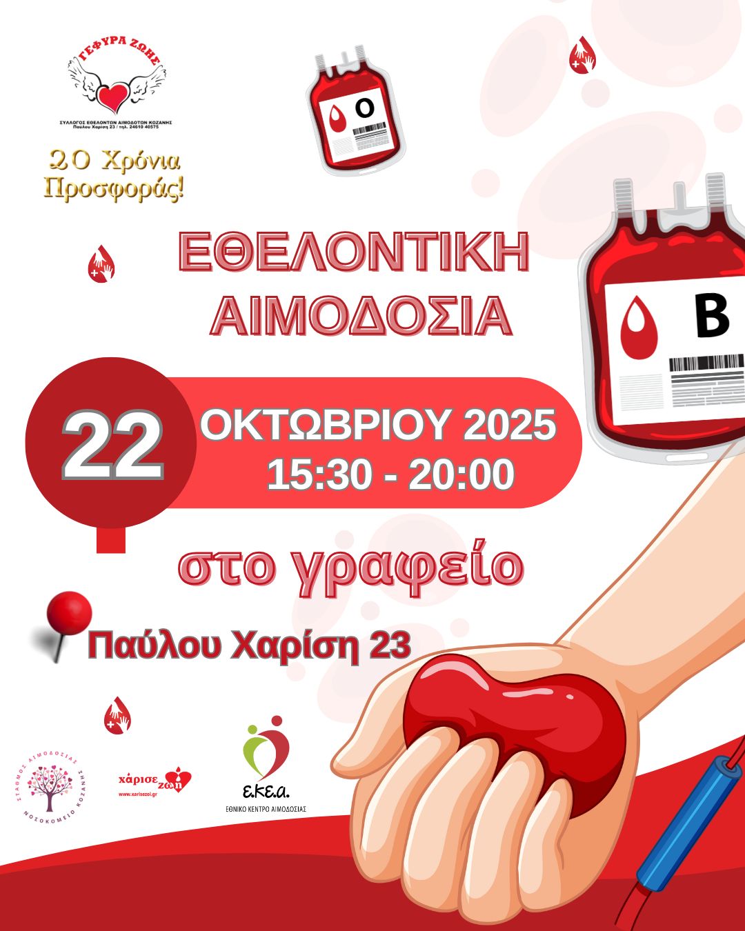 Με μήνυμα αλληλεγγύης και κοινωνικής ευαισθησίας, ο Σύλλογος Εθελοντών Αιμοδοτών Κοζάνης «Γέφυρα Ζωής» καλεί τους πολίτες να συμμετάσχουν στην 28η αιμοδοσία του 2025, που θα πραγματοποιηθεί την Τετάρτη 22 Οκτωβρίου από τις 15:30 έως τις 20:00 (με προσέλευση έως τις 19:30) στα γραφεία του συλλόγου, επί της οδού Παύλου Χαρίση 23.