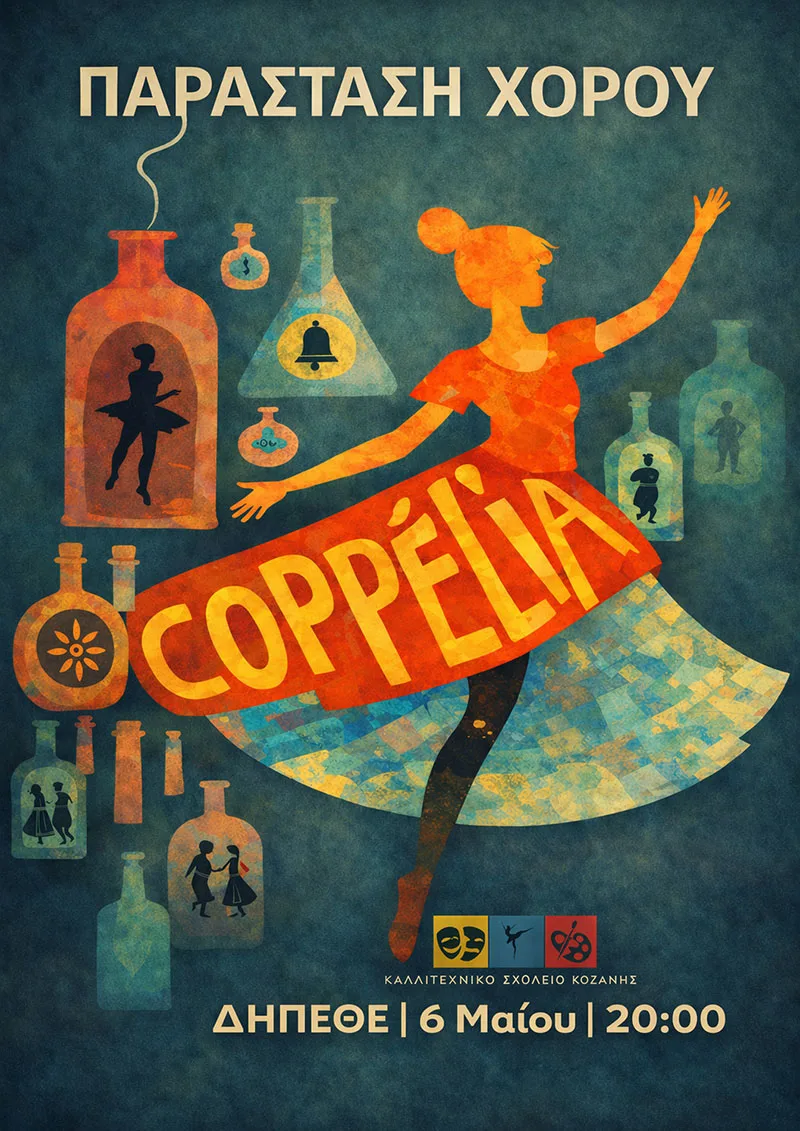 Η παράσταση θα πραγματοποιηθεί την Τετάρτη 6 Μαΐου, στις 20:00, στο ΔΗΠΕΘΕ Κοζάνης, με κεντρικό άξονα τον χορό και τη σκηνική έκφραση. Σύμφωνα με το πρόγραμμα, το πρώτο μέρος περιλαμβάνει αποσπάσματα από την «Coppélia», σε μουσική του Léo Delibes, με χορογραφία βασισμένη στο πρωτότυπο έργο των Marius Petipa και Enrico Cecchetti και διασκευή – διδασκαλία από την Αμαλία Τζώγα.