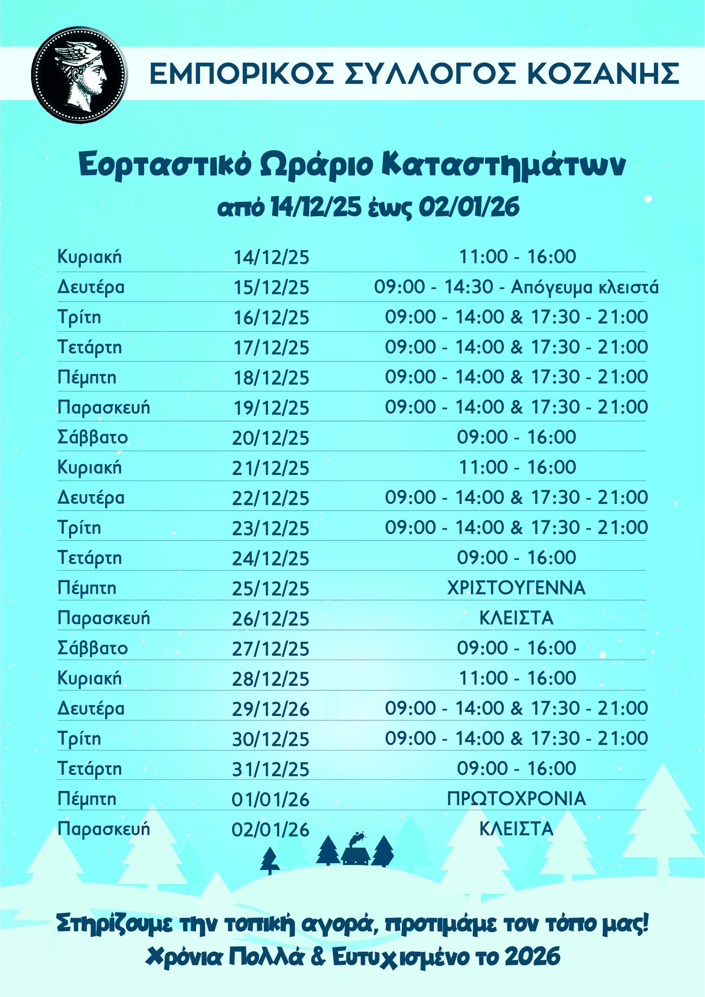 Ο Εμπορικός Σύλλογος Κοζάνης ανακοινώνει το εορταστικό Ωράριο των καταστημάτων για τις ημέρες των Χριστουγέννων και της Πρωτοχρονιάς.