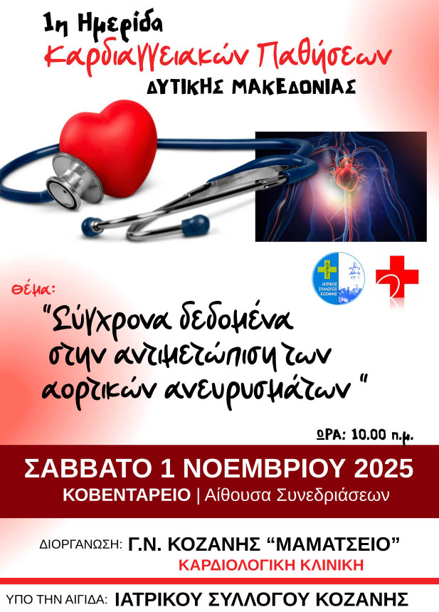 Στην Κοζάνη θα πραγματοποιηθεί η 1η Ημερίδα Καρδιαγγειακών Παθήσεων Δυτικής Μακεδονίας, με θέμα «Σύγχρονα Δεδομένα στην Αντιμετώπιση των Αορτικών Ανευρυσμάτων». Η εκδήλωση θα λάβει χώρα το Σάββατο 1 Νοεμβρίου 2025, στις 10:00 π.μ., στην Αίθουσα Συνεδριάσεων του Κοβενταρείου, υπό την αιγίδα του Ιατρικού Συλλόγου Κοζάνης.