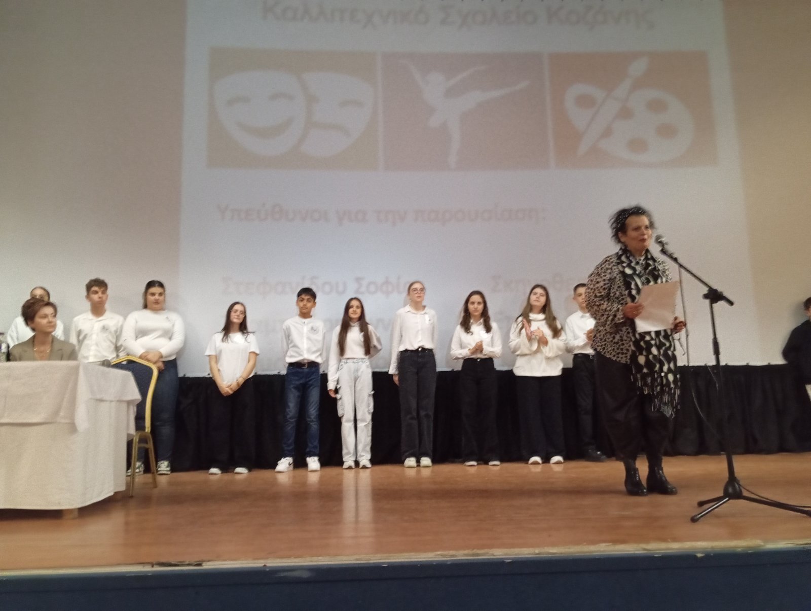Ιδιαίτερη στιγμή της εκδήλωσης αποτέλεσε η παρουσίαση της εργασίας «Μαθηματικά και Λογοτεχνία» από μαθητές και μαθήτριες του Καλλιτεχνικού Σχολείου Κοζάνης, υπό την καθοδήγηση των καθηγητριών τους, κ. Στεφανίδου Σοφίας (Θεάτρου) και κ. Τσαμπούρη Άννας (Μαθηματικών).