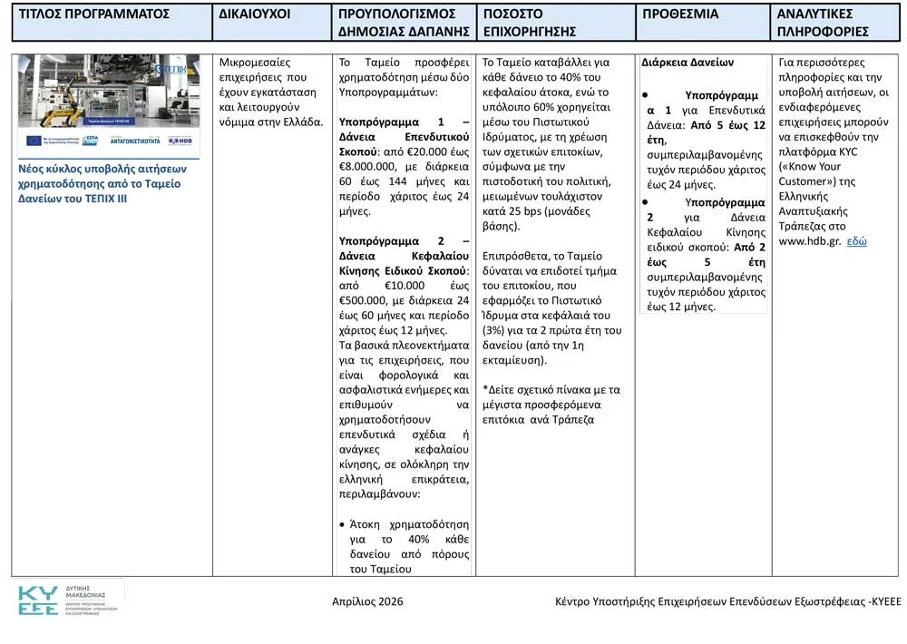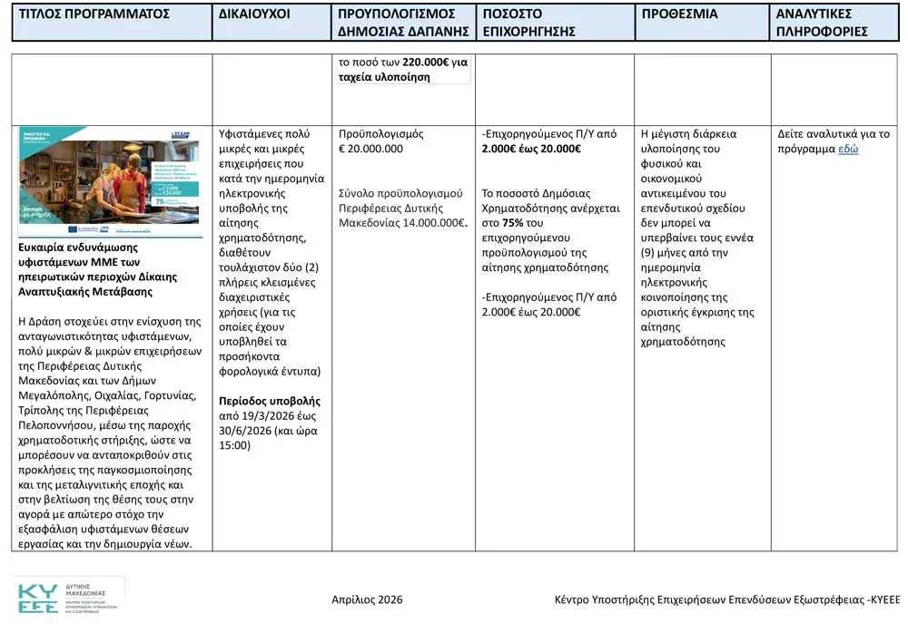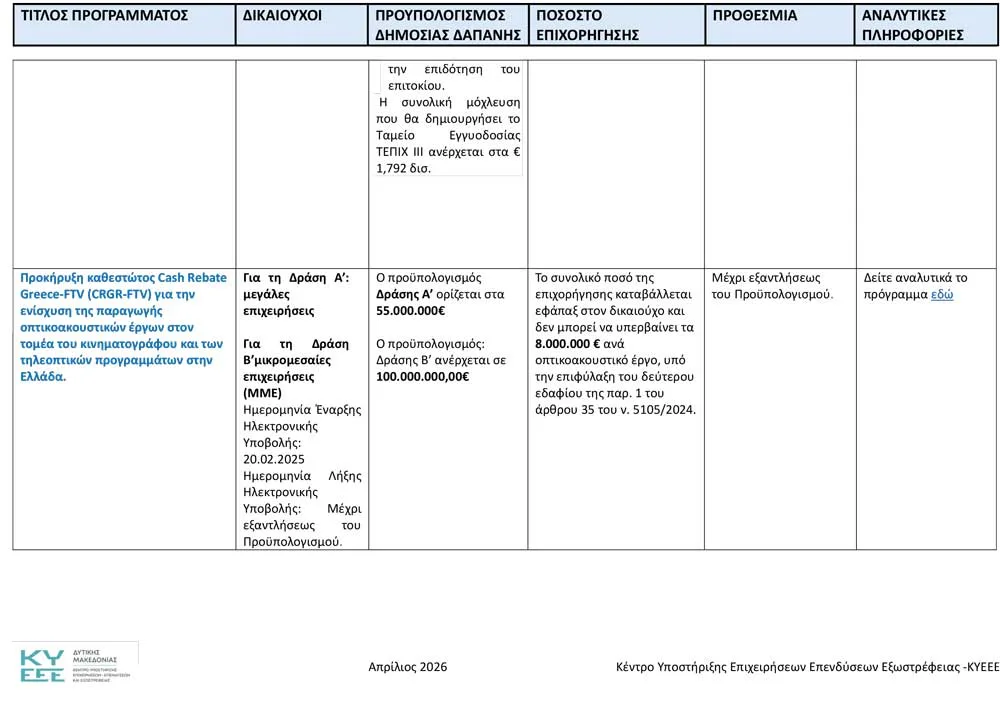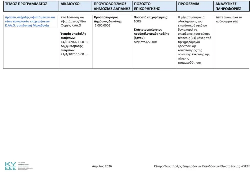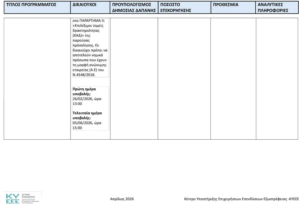Το Κέντρο Υποστήριξης Επιχειρήσεων, Επενδύσεων και Εξωστρέφειας Δυτικής Μακεδονίας ανακοινώνει όλα τα ενεργά προγράμματα, για τον Απρίλιο του 2026.