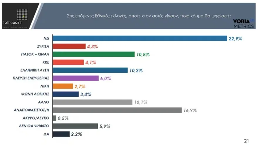 Ένα πολύ σημαντικό ποσοστό των ερωτηθέντων στο 10,1% δηλώνει ότι επιλέγει κάποιο άλλο από τα κόμματα, ενώ οι αναποφάσιστοι φτάνουν στο επίσης πολύ υψηλό 16,9% και όσοι δηλώνουν από τώρα ότι δεν θα ψηφίσουν επίσης είναι σε υψηλό ποσοστό 5,9%.