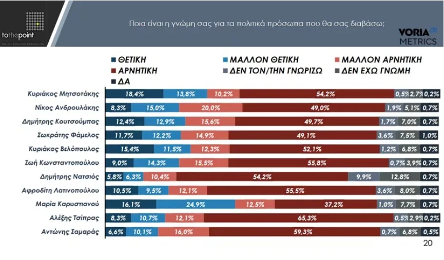 Στις θετικές και μάλλον θετικές γνώμες μετά τη Μαρία Καρυστιανού και τον Κυριάκο Μητσοτάκη έρχεται ο Κυριάκος Βελόπουλος με 26,9%, ακολουθεί (να ακόμα κάτι αξιοσημείωτο) ο Αντώνης Σαμαράς με 26,1% και ο Δημήτρης Κουτσούμπας του ΚΚΕ με 25,3%.