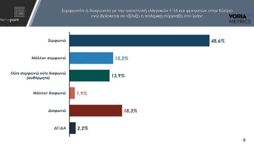 Για την αποστολή F16 και φρεγατών στην Κύπρο περίπου οι μισοί δηλώνουν ξεκάθαρα σύμφωνοι, ενώ αν προστεθούν και όσοι δηλώνουν μάλλον σύμφωνοι το ποσοστό που εγκρίνει την κυβερνητική πρωτοβουλία φτάνει στο 63,8%.
