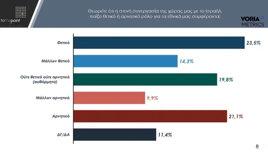 Για τον ρόλο που παίζει η στενή συνεργασία Ελλάδας – Ισραήλ στα εθνικά μας συμφέροντα οι γνώμες μοιράζονται. Θετικά και μάλλον θετικά βλέπει τη συνεργασία αυτή το 37,8% των ερωτηθέντων, ούτε κρύο ούτε ζέστη λέει το 19,8%, ενώ αρνητική και μάλλον αρνητική την χαρακτηρίζει ένα ποσοστό 31%.