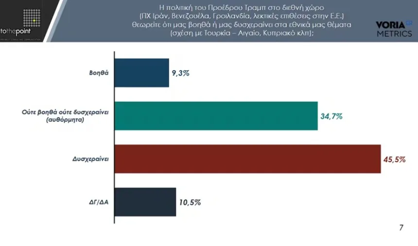 Για το πώς επηρεάζει η πολιτική Τραμπ τα εθνικά μας θέματα, οι συμμετέχοντες θεωρούν σε ποσοστό 45,5% ότι δυσχεραίνει τα εθνικά μας θέματα η στάση του Αμερικανού προέδρου και μόλις το 9,3% δηλώνει ότι τα βοηθά.