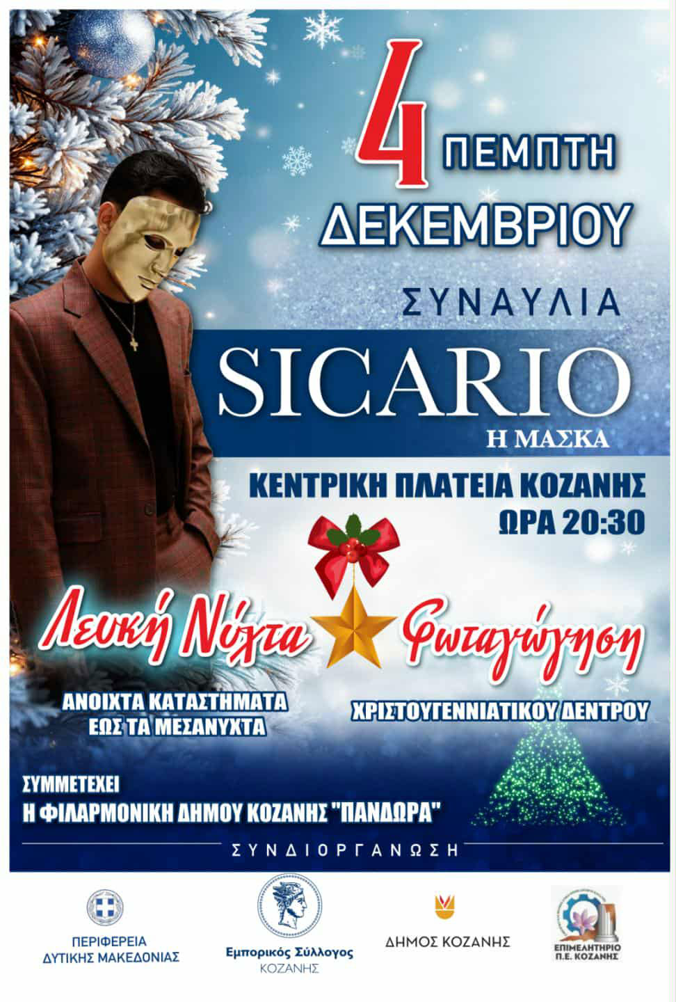 «Η Κοζάνη γιορτάΖΕΙ και πάλι», από την Πέμπτη 5 Δεκεμβρίου 2024. Την ίδια ημερομηνία θα γίνει η φωταγώγηση του Χριστουγεννιάτικου δέντρου και το παρόν θα δώσει όπως κάθε χρόνο παραδοσιακά η αγαπημένη μας ΠΑΝΔΩΡΑ! Πρόκειται για μια βραδιά που θα μετατρέψει την πόλη μας σε ψυχαγωγικό επίκεντρο! Φέτος η μεγάλη συναυλία που συνδιοργανώνεται με την Περιφέρεια Δυτικής Μακεδονίας, τον Δήμο Κοζάνης και το Επιμελητήριο Κοζάνης φιλοξενεί τον Sicario και έχει σκοπό να προσελκύσει επισκέπτες από τις γειτονικές περιοχές και όχι μόνο.