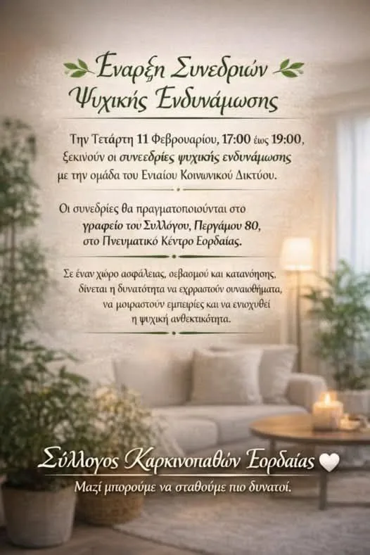 Οι συνεδρίες θα πραγματοποιούνται στο γραφείο του συλλόγου, (Περγάμου 80) στο Πνευματικό Κέντρο Εορδαίας και στόχος είναι σε ένα χώρο ασφάλειας, σεβασμού και κατανόησης οι συμμετέχοντες να μοιραστούν εμπειρίες και να ενισχυθεί η ψυχική ανθεκτικότητα.