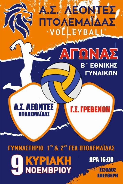 Την Κυριακή 9 Νοεμβρίου, στις 16:00, ο Α.Σ. Λέοντες Πτολεμαΐδας φιλοξενεί τον Γ.Σ. Γρεβενών για το πρωτάθλημα της Β’ Εθνικής Γυναικών στο γυμναστήριο του 1ου & 2ου ΓΕΛ Πτολεμαΐδας, με ελεύθερη είσοδο για το κοινό.