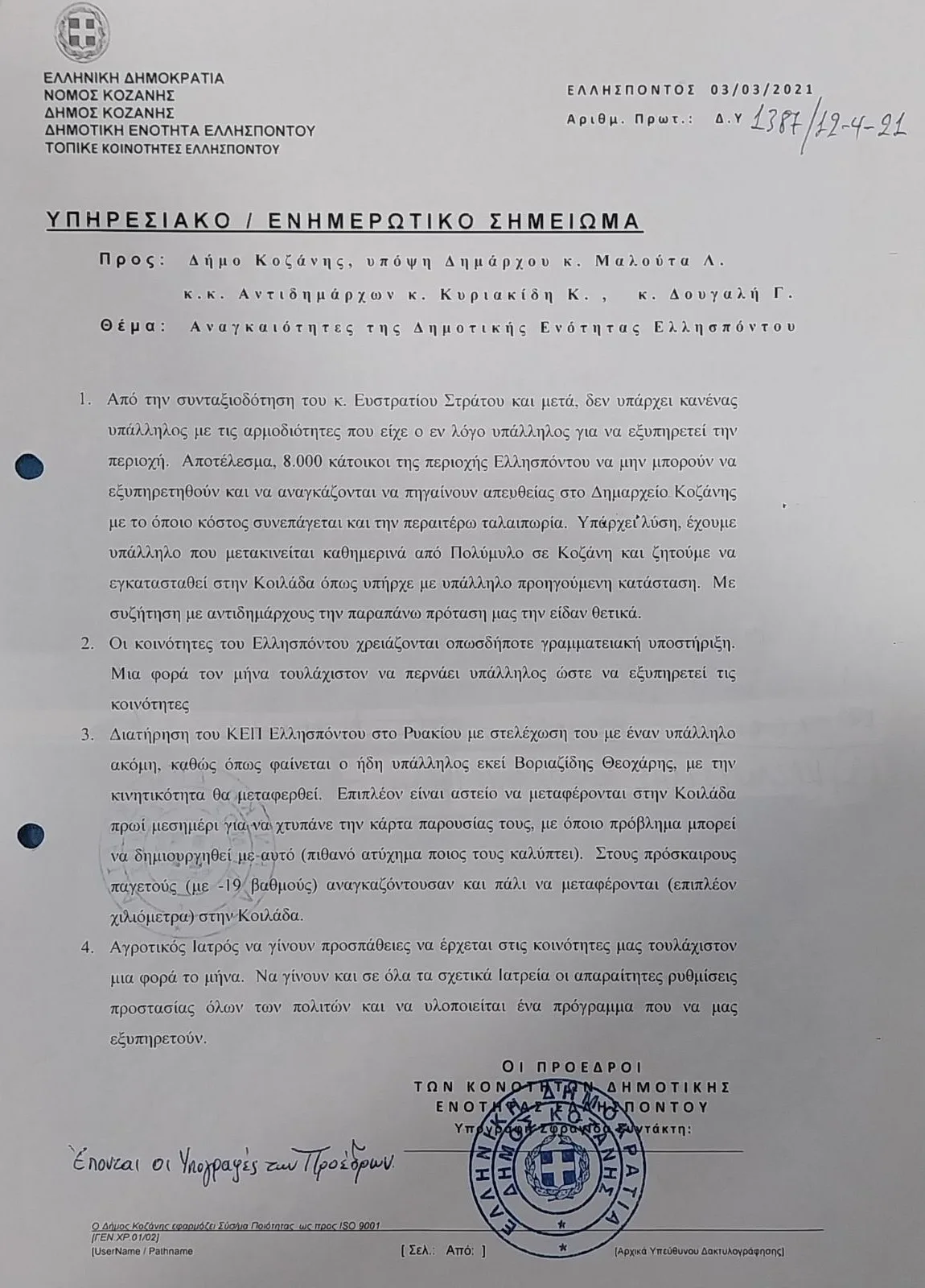 Η αλήθεια όμως τον διαψεύδει κατηγορηματικά και για μια ακόμη φορά καθώς σύμφωνα με έγγραφο του 2021, έντεκα Πρόεδροι των Κοινοτήτων της Δημοτικής Ενότητας Ελλησπόντου, είχαν όντως αποστείλει στον κ. Μαλούτα το εν λόγω αίτημα, για το οποίο ήταν μάλιστα σύμφωνοι και Αντιδήμαρχοι εκείνης της εποχής, όπως τονίζουν στην επιστολή τους. Αίτημα που του ζητούσαν να παρέμβει για τη διατήρηση του εκεί Ληξιαρχείου, προτείνοντάς του μάλιστα και σχετική λύση. Αυτός όμως τους αγνόησε όλους! Όπως πάντα βέβαια! Άσχετα εάν τώρα χύνει κροκοδείλια δάκρυα για το Ληξιαρχείο της Αιανής, και αφού πρώτα έβαλε ο ίδιος την ταφόπλακα στην αντίστοιχη δομή του Ελλησπόντου, που είχε και πολλαπλάσιες πράξεις σε σχέση με την Αιανή.