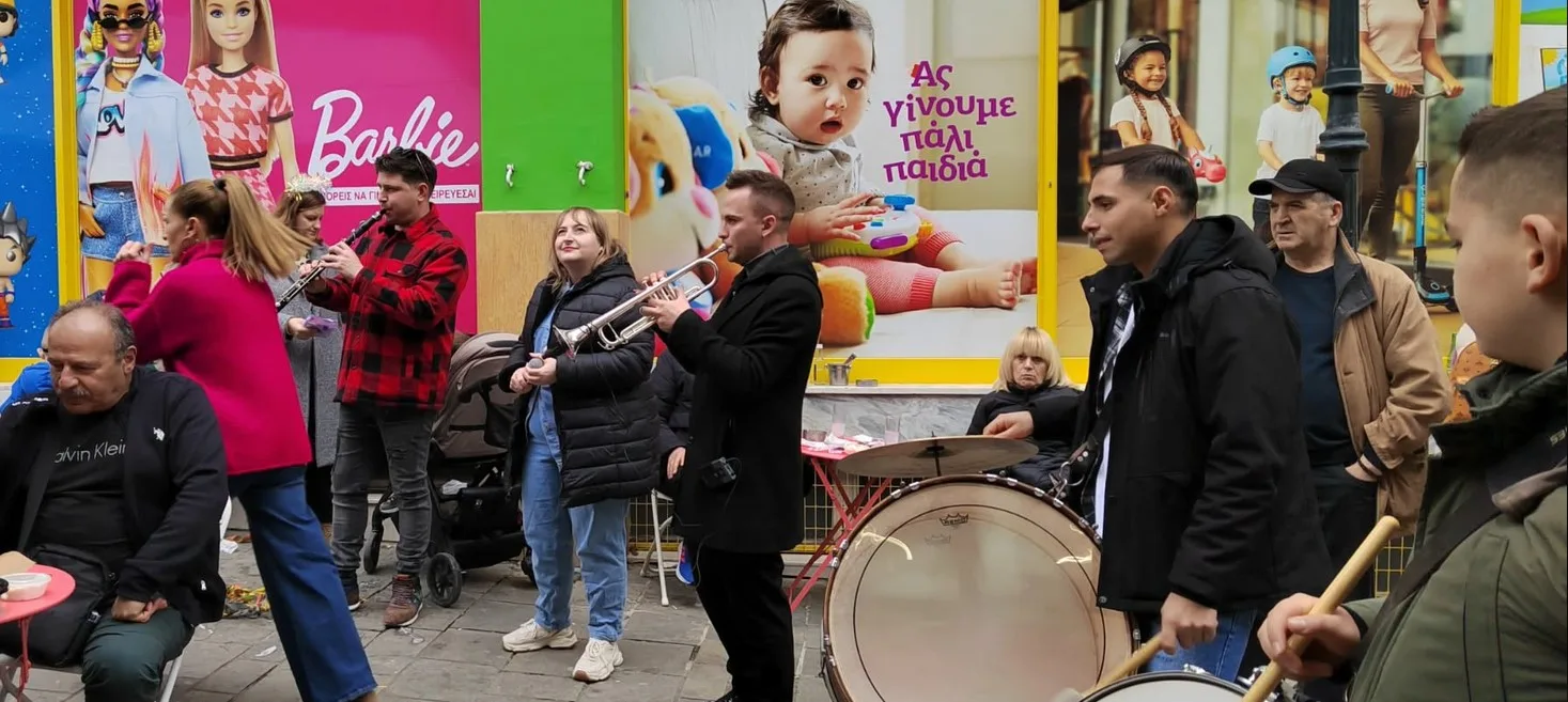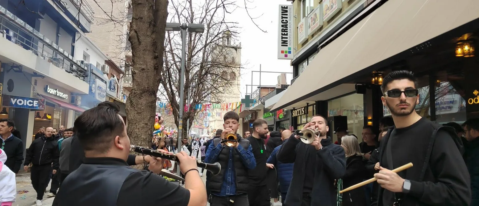 Τα χάλκινα έδωσαν τον παλμό της ημέρας, με τους οργανοπαίκτες να ξεσηκώνουν τον κόσμο και να δημιουργούν ένα αυθεντικό σκηνικό Αποκριάς.