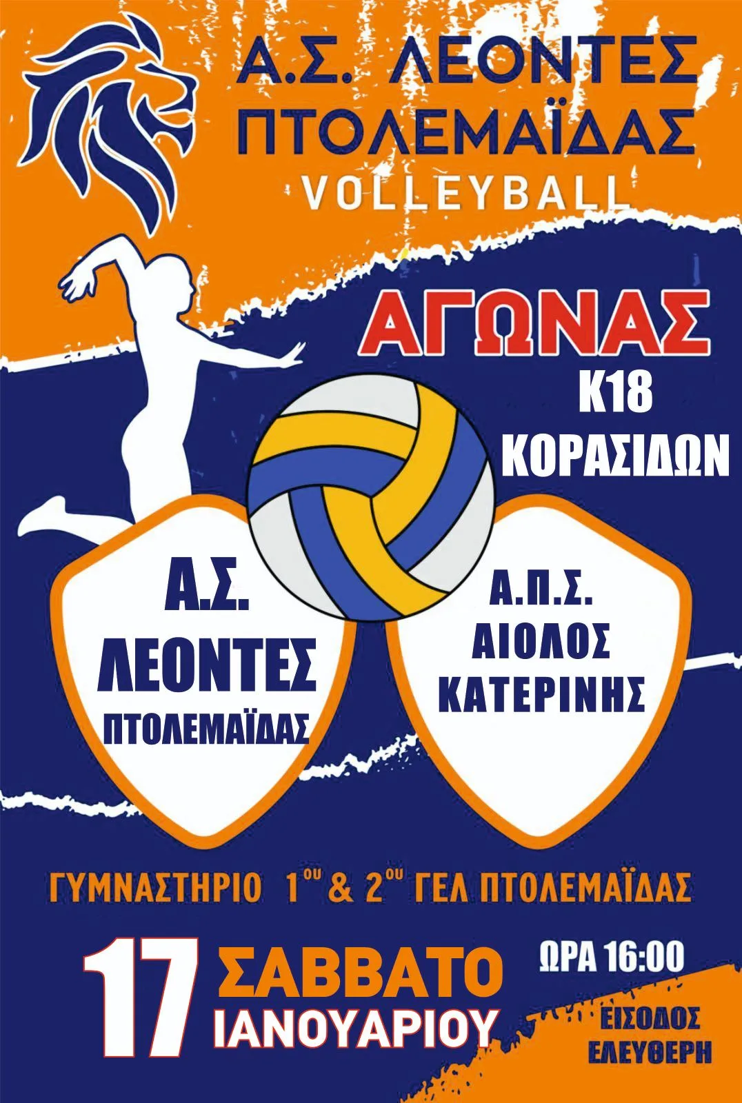 Το Σάββατο 17/1 και ώρα 16:00 στο Γυμναστήριο του 1ου-2ου ΓΕΛ Πτολεμαΐδας οι Κορασίδες Κ18 του Α.Σ. ΛΕΟΝΤΕΣ Πτολεμαΐδας θα αντιμετωπίσουν τα κορίτσια του Α.Π.Σ. ΑΙΟΛΟΣ Κατερίνης.