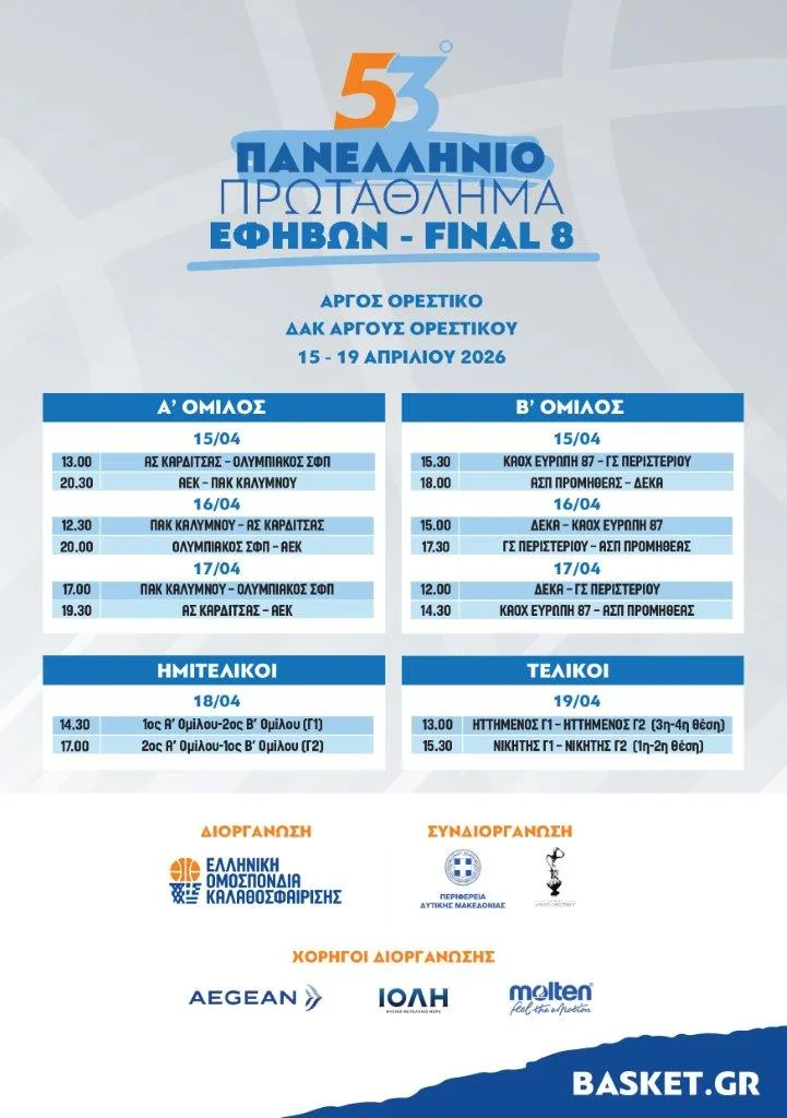Το Άργος Ορεστικό ετοιμάζεται να υποδεχθεί από τις 15 έως τις 19 Απριλίου 2026 την τελική φάση του 53ου Πανελλήνιου Πρωταθλήματος Εφήβων, με το Final 8 να φιλοξενείται στο ΔΑΚ Άργους Ορεστικού.
