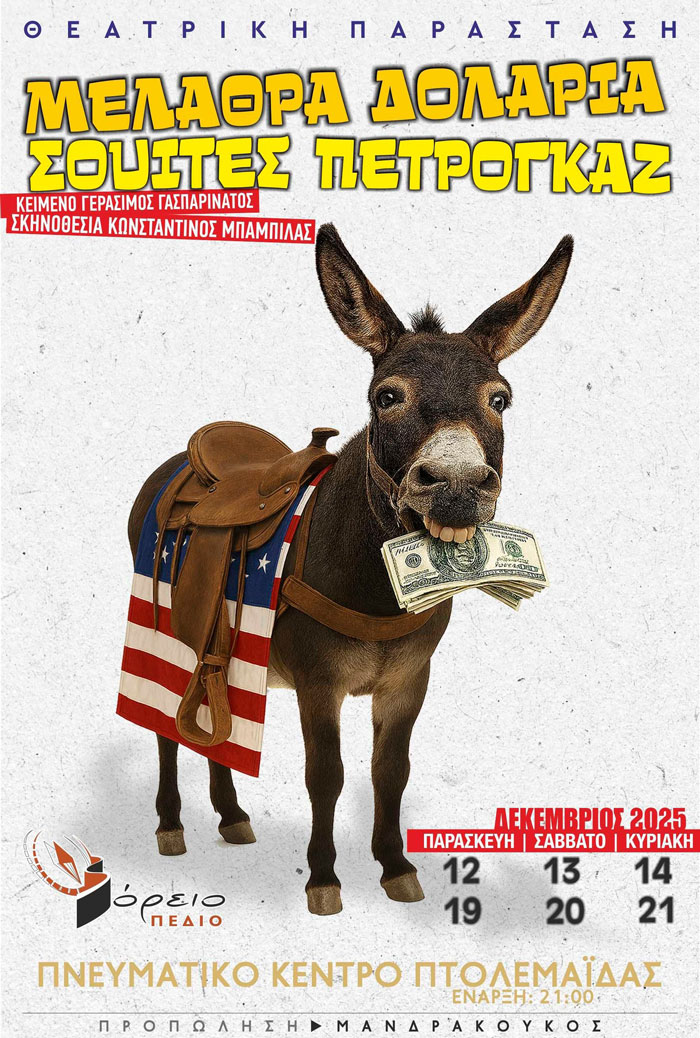 Η νέα θεατρική παραγωγή «Μελάθρα Δολάρια Σουίτες Πετρογκάζ» μας μεταφέρει στον κάμπο της Θεσσαλίας, σε μια εποχή όπου η μετεμφυλιακή Ελλάδα προσπαθεί να αναπτυχθεί και να ενταχθεί στη ζωή της κάθε ξενόφερτη καινοτομία. Η πλατεία του χωριού γίνεται το σκηνικό όπου η απλή ζωή των κατοίκων αναστατώνεται από μια απρόσμενη επιστροφή, πυροδοτώντας μια σειρά από κωμικοτραγικές καταστάσεις.