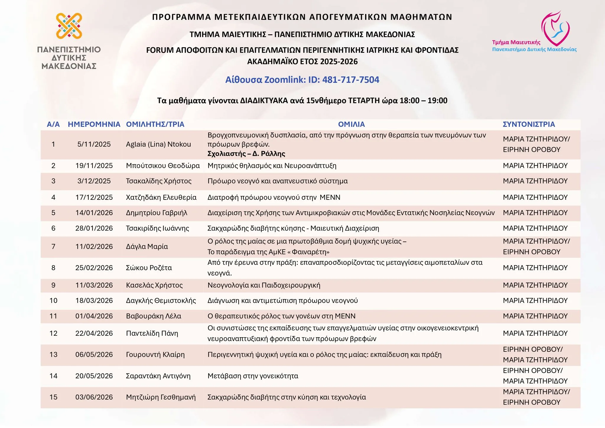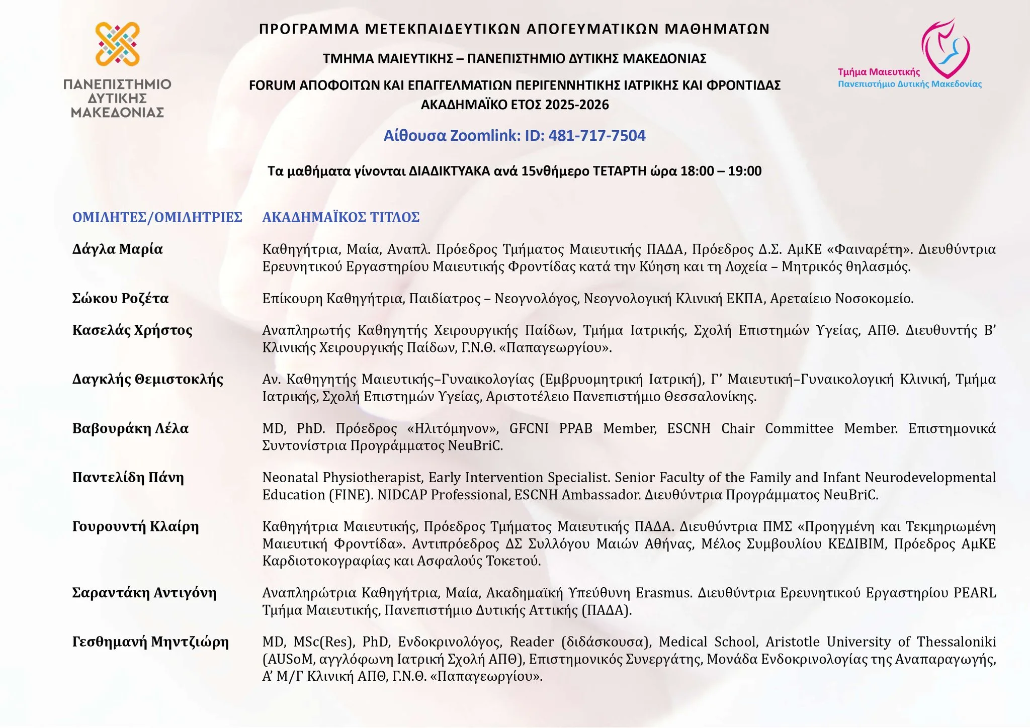Συνεχίζοντας τον κύκλο των διαδικτυακών μετεκπαιδευτικών μαθημάτων το Τμήμα Μαιευτικής της Σχολής Επιστήμων Υγείας του Πανεπιστημίου Δυτικής Μακεδονίας έχει την τιμή στο ενδέκατο μάθημα να υποδέχεται διαδικτυακά ως προσκεκλημένη ομιλήτρια την κ.Λέλα Βαβουράκη , πρόεδρο του Ηλιτόμηνου .