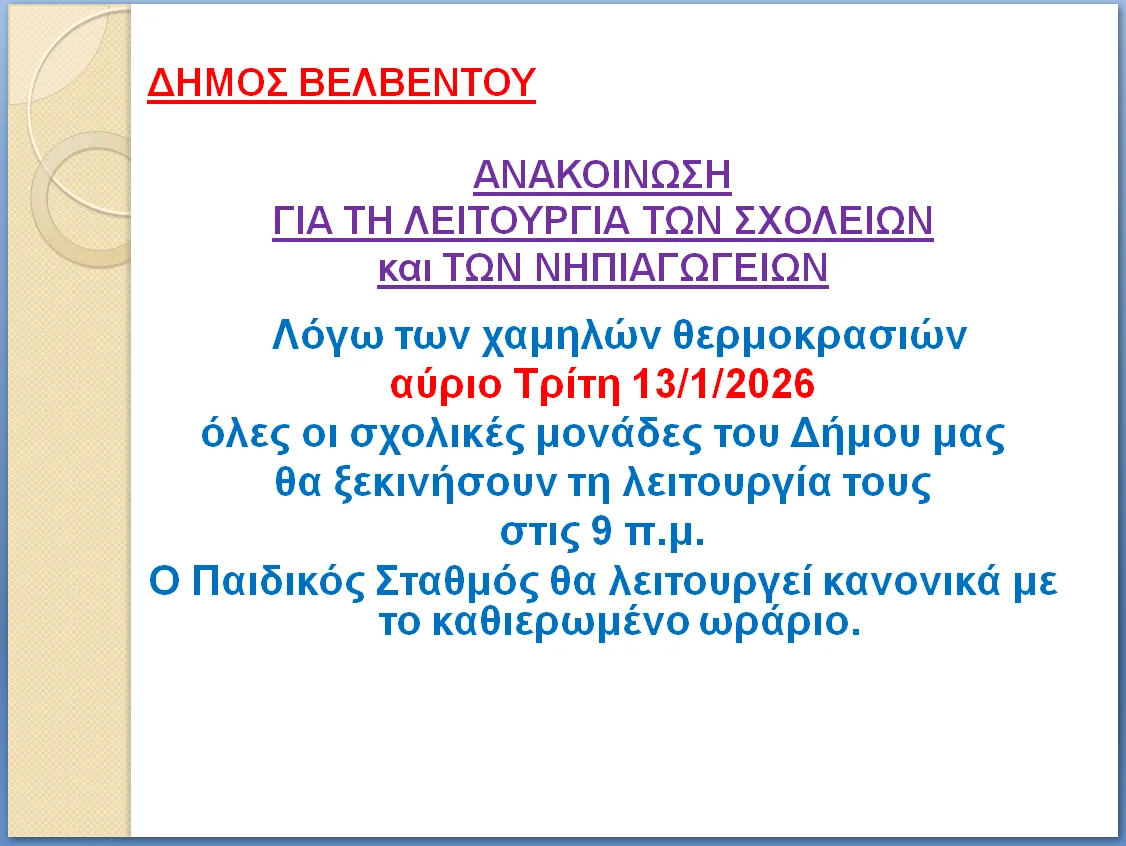 Tags: Δήμος Βελβεντούλειτουργία σχολείων