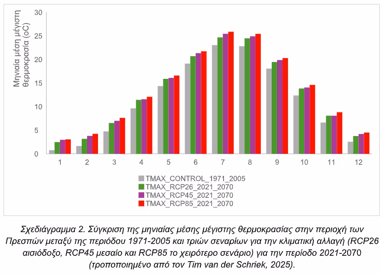 Τα διάφορα προγνωστικά μοντέλα σε διαφορετικά επίπεδα υψηλών εκπομπών αερίων του θερμοκηπίου δεν αφήνουν περιθώρια εφησυχασμού. Για την περιοχή των Πρεσπών προβλέπεται αύξηση της μέσης θερμοκρασίας κατά 1,5°C–3°C έως το 2070, όπως φαίνεται και στο Σχεδιάγραμμα 2. Οι ημέρες με θερμοκρασίες άνω των 35°C αναμένεται να πολλαπλασιαστούν, ενώ οι περίοδοι ξηρασίας θα γίνουν συχνότερες και εντονότερες.