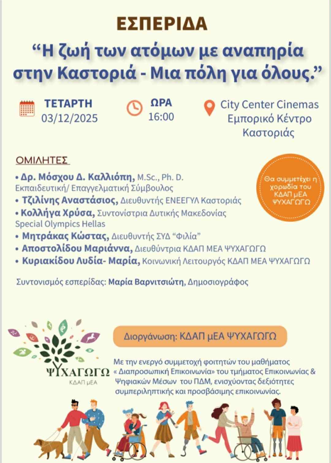 Μια σημαντική εσπερίδα με επίκεντρο τη ζωή των ατόμων με αναπηρία στην Καστοριά και το όραμα για μια πόλη πραγματικά προσβάσιμη για όλους, διοργανώνει το ΚΔΑΠ ΜεΑ «Ψυχαγωγώ». Η εκδήλωση θα πραγματοποιηθεί την Τετάρτη 3 Δεκεμβρίου, στις 16:00, στο City Center Cinemas του εμπορικού κέντρου Καστοριάς.
