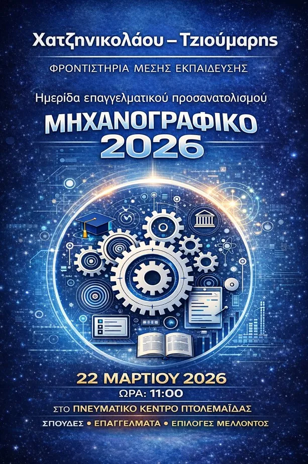 Τα Φροντιστήρια Μέσης Εκπαίδευσης Χατζηνικολάου Τζιούμαρης σας προσκαλούν στην Ημερίδα Επαγγελματικού Προσανατολισμού που διοργανώνουν την Κυριακή 22 Μαρτίου και ώρα 11:00 στο Πνευματικό Κέντρο Πτολεμαΐδας. Οι επαγγελματίες σύμβουλοι επαγγελματικού προσανατολισμού του Φροντιστηρίου θα δώσουν συμβουλές για τις επιλογές των σπουδών τα επαγγέλματα και όλα όσα αφορούν τους υποψήγιους των Πανελλαδικών Εξετάσεων.