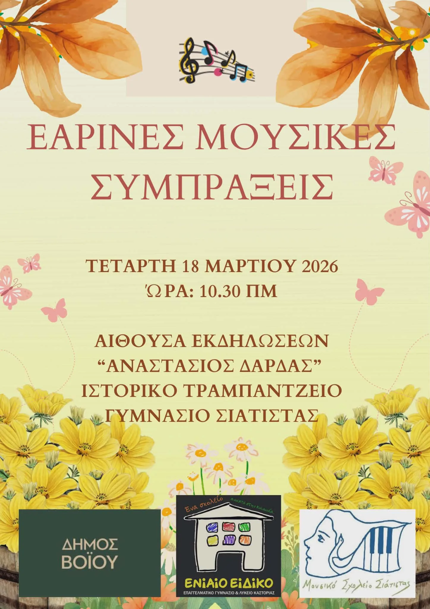 Τις «Εαρινές μουσικές συμπράξεις» παρουσιάζει ο Δήμος Βοΐου σε συνεργασία με το Μουσικό Σχολείο Σιάτιστας, σε μια εκδήλωση αφιερωμένη στη μουσική έκφραση και τη δημιουργική συνεργασία των μαθητών.