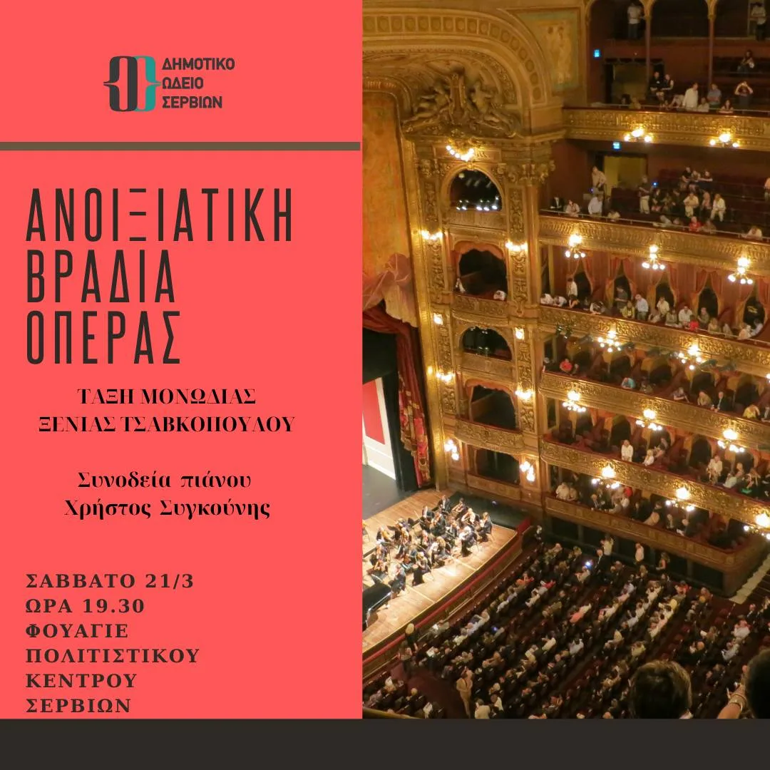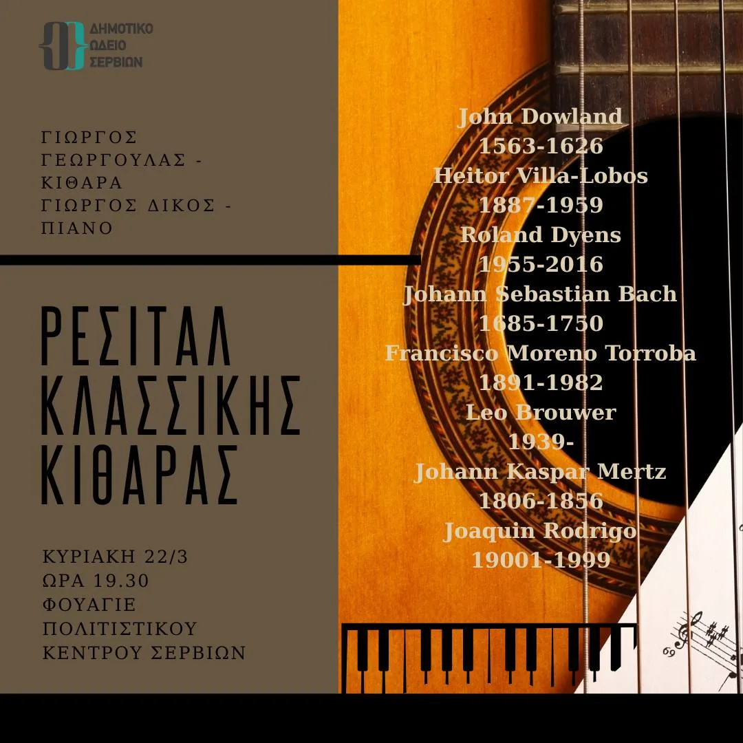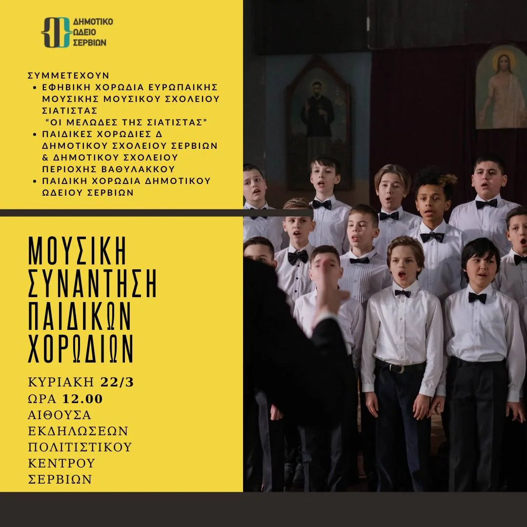Μουσικό διήμερο διοργανώνει το Δημοτικό Ωδείο Σερβίων το Σάββατο 21 και την Κυριακή 22 Μαρτίου στο Πολιτιστικό Κέντρο Σερβίων, παρουσιάζοντας ένα πρόγραμμα με επίκεντρο τη μουσική δημιουργία και την καλλιτεχνική εκπαίδευση.