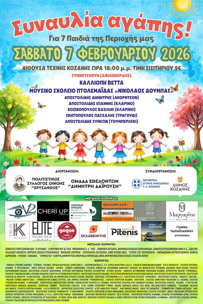 διαβάστε σχετικά: Συναυλία Αγάπης στην Κοζάνη – Συμμετέχουν Καλλιόπη Βέττα, Μουσικό Σχολείο Πτολεμαΐδας και άλλοι καλλιτέχνες