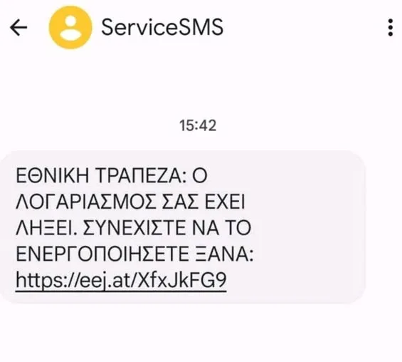 Ακόμη ένα παράδειγμα απατηλού μηνύματος, το οποίο περιέχει ηλεκτρονικό σύνδεσμο (link), αυτή τη φορά σε μορφή γραπτού μηνύματος (SMS) σε κινητό τηλέφωνο.”