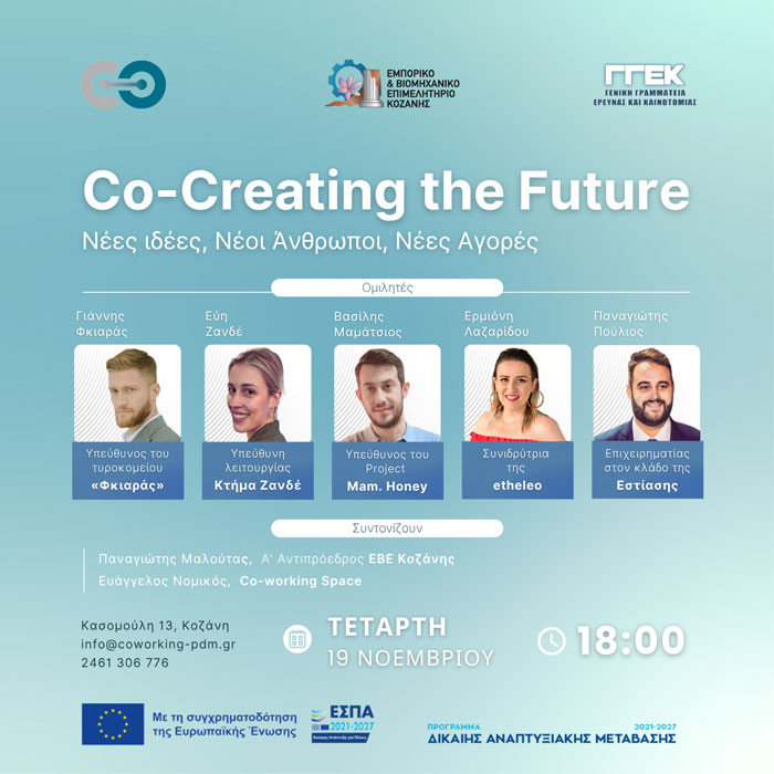 Με επιτυχία ολοκληρώθηκε την Τετάρτη 19 Νοεμβρίου 2025, στον Συνεργατικό Χώρο Εργασίας Δυτικής Μακεδονίας, η ανοιχτή συζήτηση με τίτλο «Co-Creating the Future: Νέες Ιδέες, Νέοι Άνθρωποι, Νέες Αγορές», που διοργανώθηκε σε συνεργασία με το Επιμελητήριο Κοζάνης.