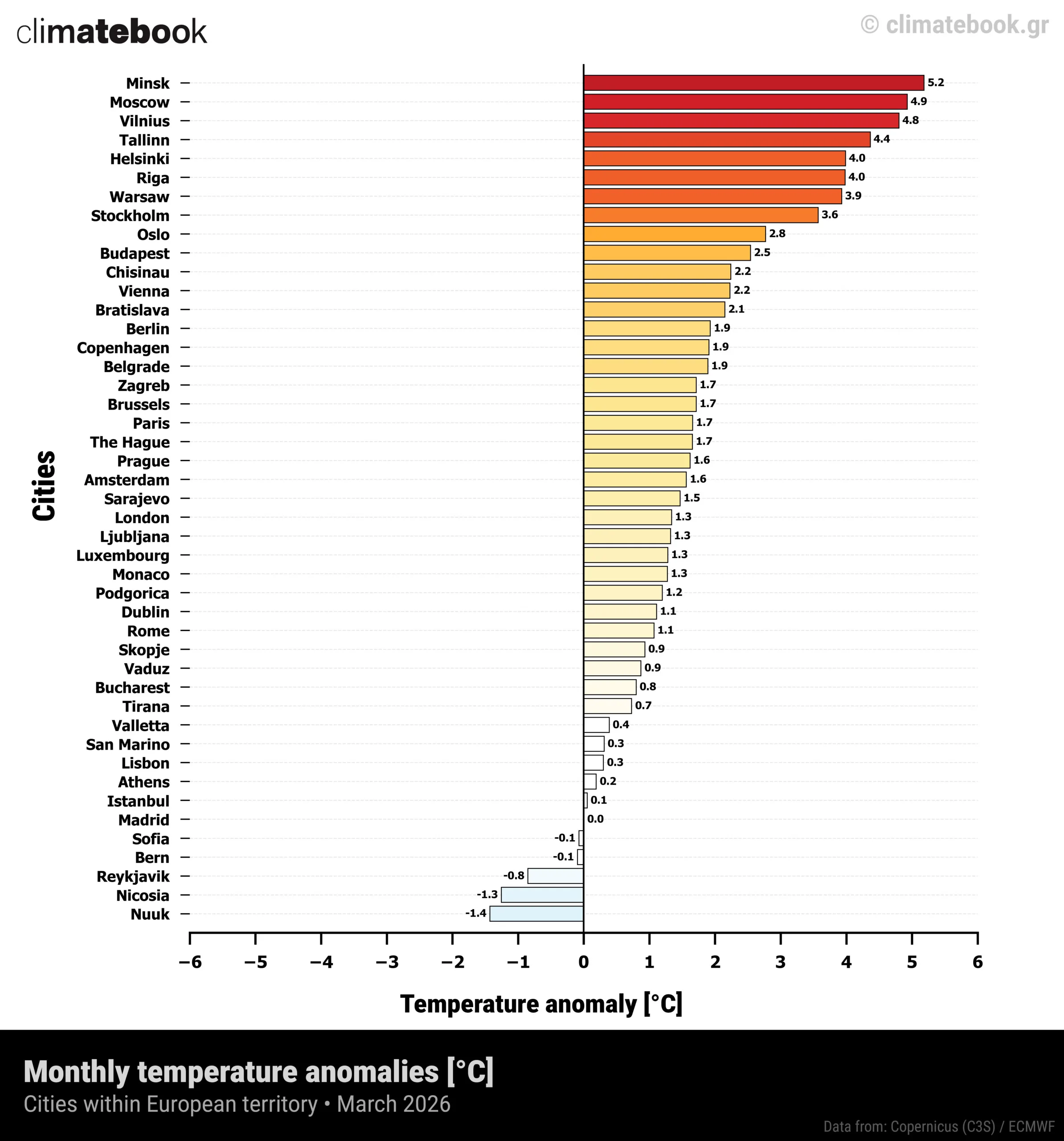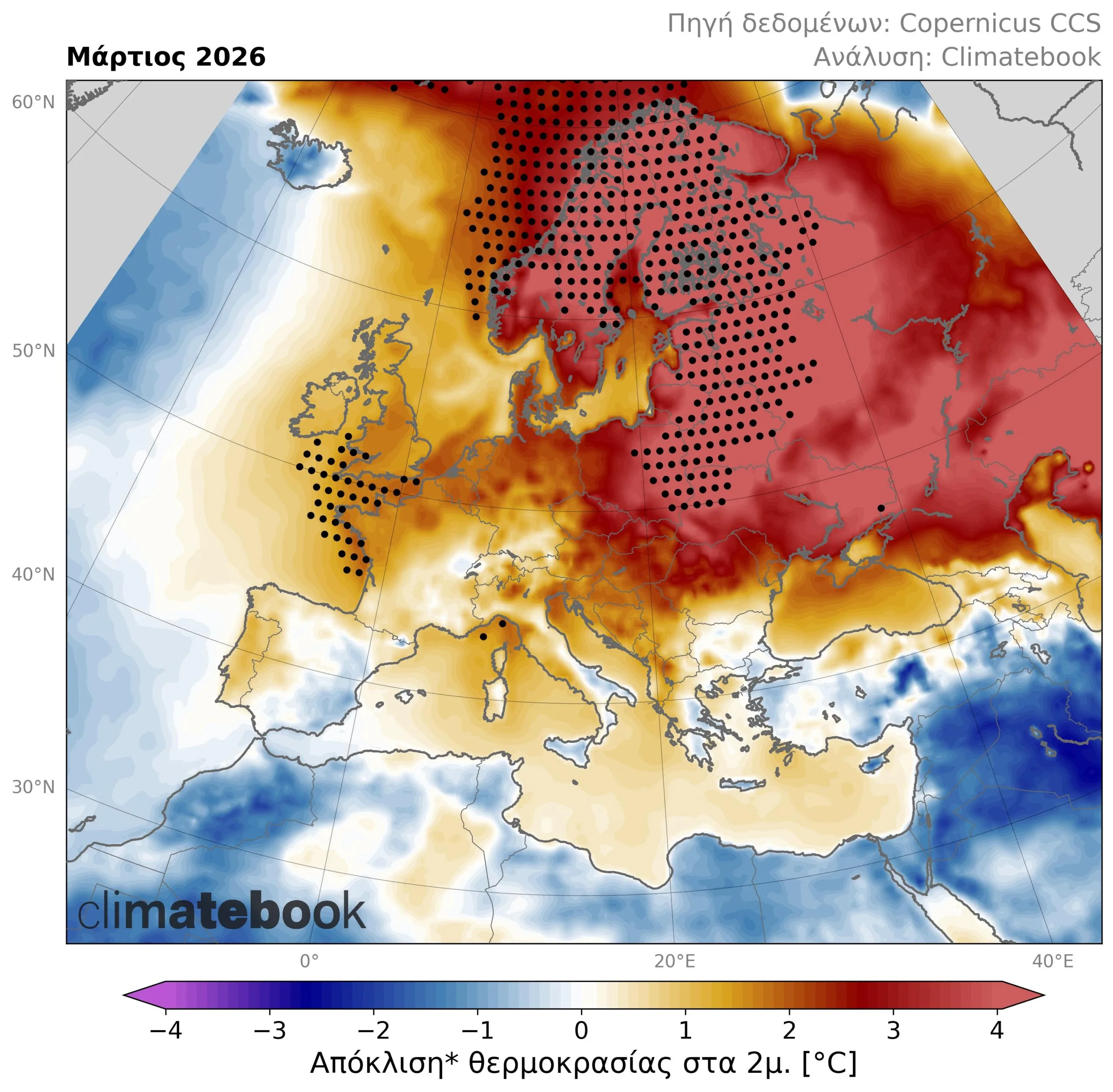 Σύμφωνα με δεδομένα του προγράμματος Copernicus (C3S), όπως αναλύθηκαν από την επιστημονική ομάδα του climatebook, ο Μάρτιος του 2026 για την Ευρώπη ήταν 2.27°C πάνω από τον μέσο όρο 1991-2020, και ήταν ο 2ος θερμότερος από το 1979.