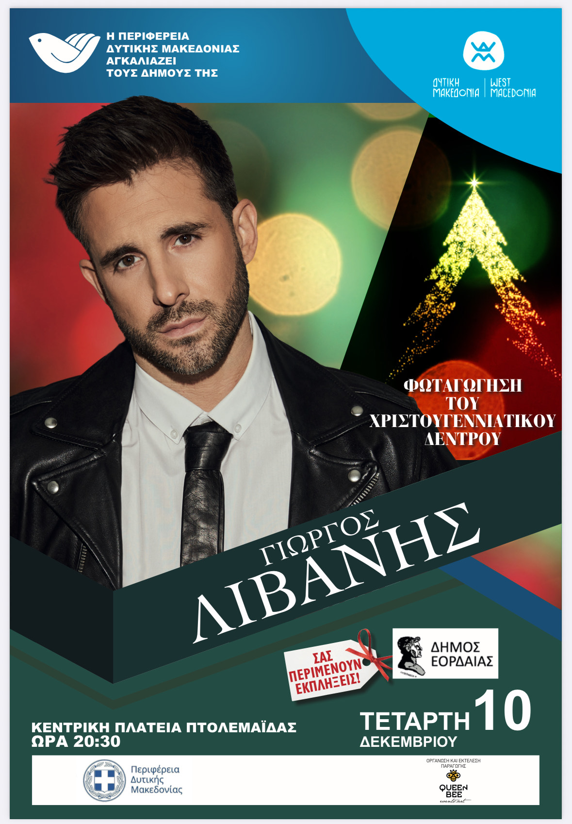 Ο Γιώργος Λιβάνης είναι ένας από τους πιο δημοφιλείς, ανερχόμενους και πολλά υποσχόμενους τραγουδιστές των τελευταίων χρόνων. Έρχεται στις 10 Δεκεμβρίου και ώρα 20:30 για τη φωταγώγηση του Χριστουγεννιάτικου δέντρου ,στην κεντρική πλατεία της Πτολεμαΐδας να μας ξεσηκώσει με τα τραγούδια του: Σεντόνι, Δεν μας χωρίζει τίποτα εμάς, Βγαίνω πίνω ξενυχτάω, Θέλω κι΄’άλλαα….όπως μόνο αυτός ξέρει. Έχει δώσει θετικά δείγματα γραφής όχι μόνο για το καλλιτεχνικό του ταλέντο αλλά και για το ήθος και την ποιότητα του χαρακτήρα του.