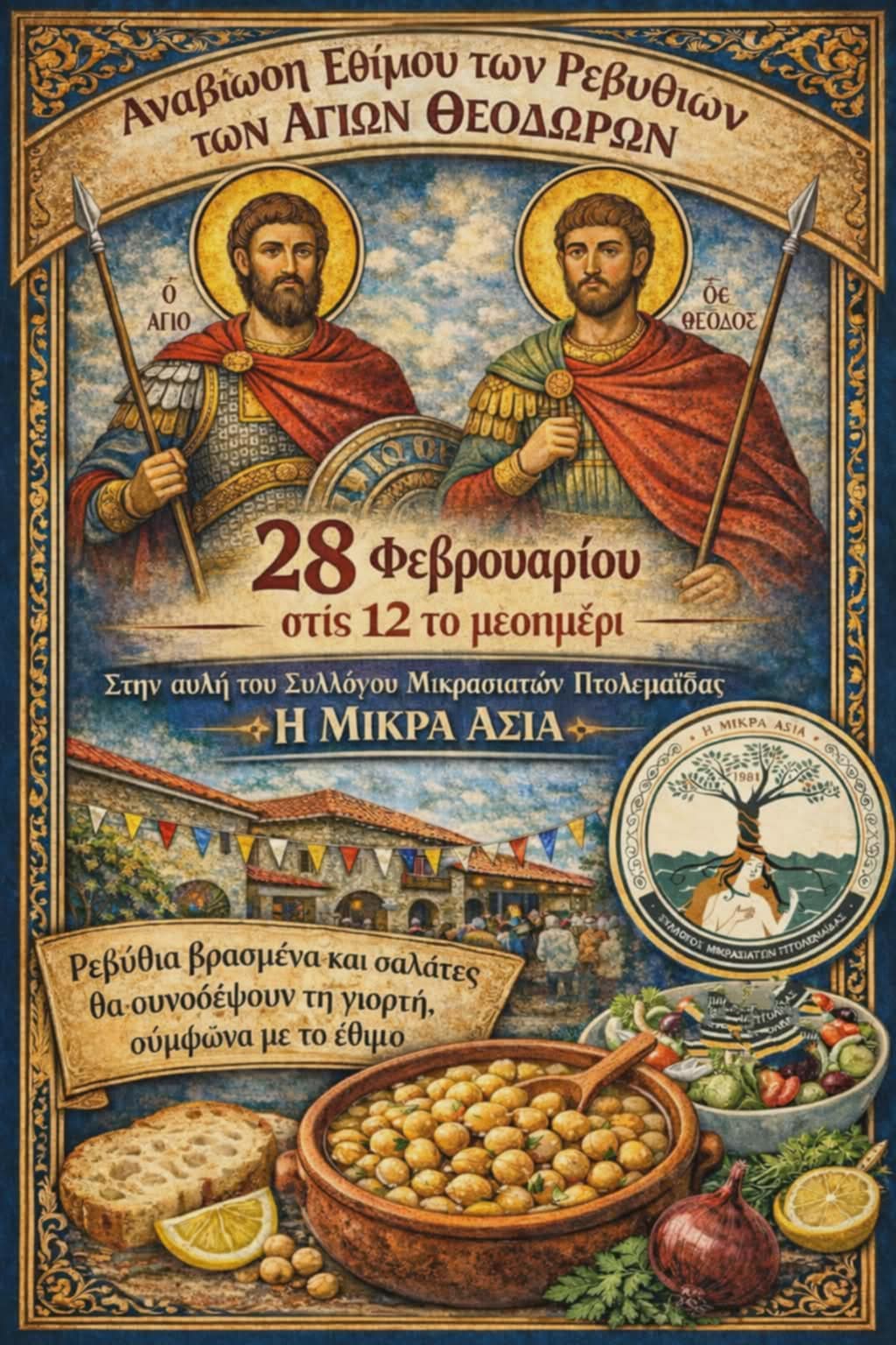 Ο Σύλλογος Μικρασιατών Πτολεμαΐδας, το Σάββατο 28 Φεβρουαρίου στις 12 το μεσημέρι, σας προσκαλεί στην αναβίωση του εθίμου των ρεβυθιων των Αγίων Θεοδώρων. Πρόκειται για έθιμο που χάνεται στα βάθη των αιώνων και συνεχίστηκε μετά το 1922, μέσα στα σπίτια των προσφύγων, κύρια εκείνων που κατάγονταν από την περιοχή της Περγάμου.