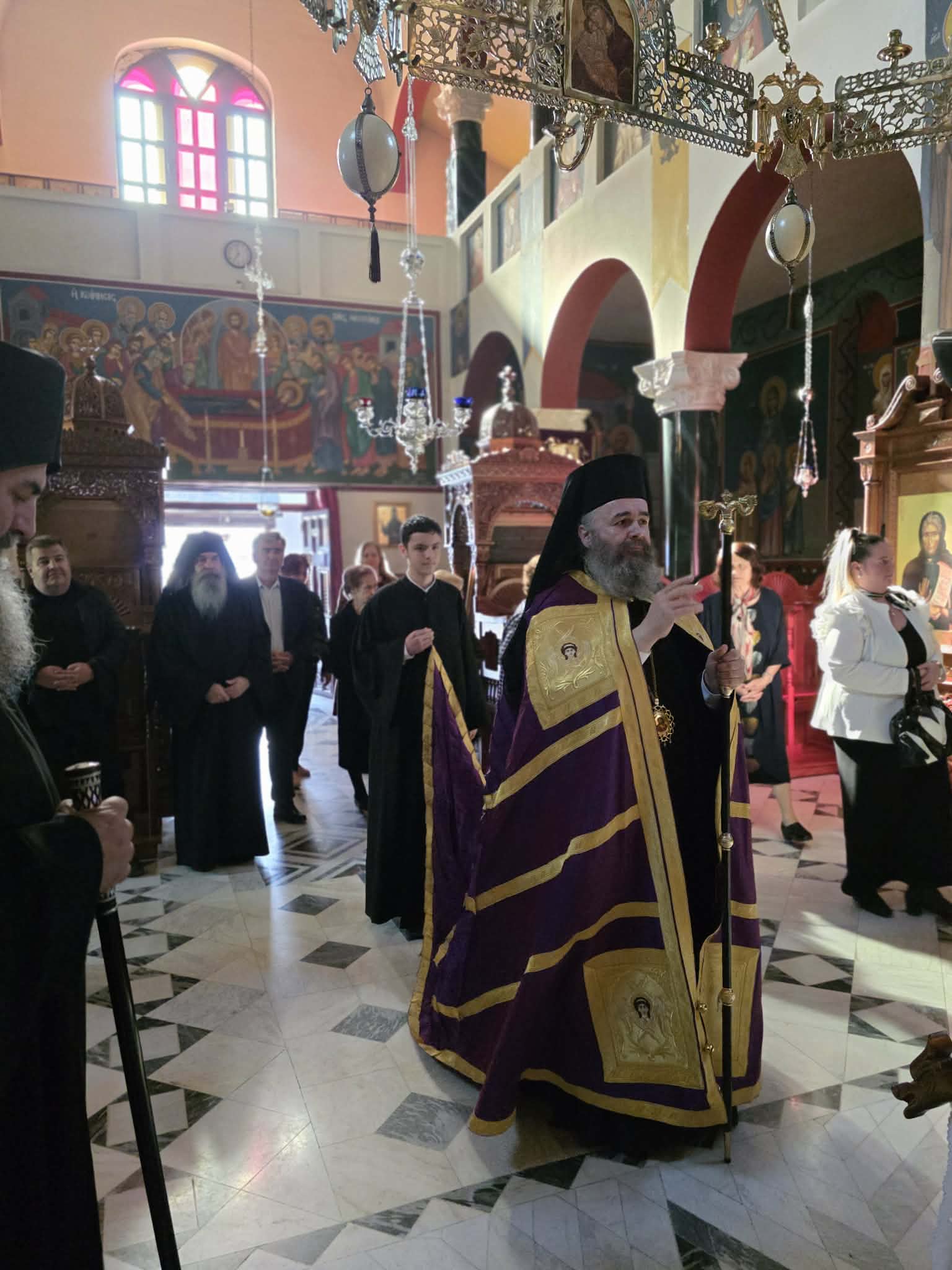 Πριν το τέλος, ο Σεβασμιώτατος ομίλησε προς το εκκλησίασμα. Αναφερόμενος στον στίχο «Κύριε, εν πολλαίς αμαρτίαις περιπεσούσα γυνή», στάθηκε στη δύναμη της μετάνοιας. Όπως τόνισε, η γυναίκα του Ευαγγελίου δεν μένει φυλακισμένη στο παρελθόν της. Με τόλμη και ταπείνωση πλησιάζει τον Χριστό και καταθέτει όλη της την ύπαρξη στα πόδια Του. Τα δάκρυά της δεν είναι απλώς έκφραση λύπης. Γίνονται μύρο ευωδιαστό και φανερώνουν την εσωτερική της μεταμόρφωση. Μέσα από τη συνάντηση με τον Νυμφίο Χριστό, η πτώση μετατρέπεται σε αρχή σωτηρίας.