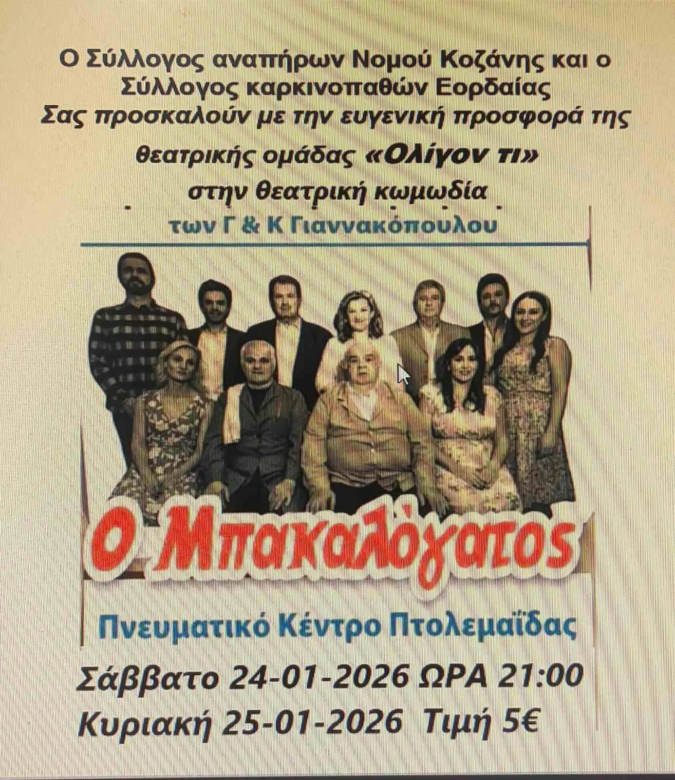 Οι δύο σύλλογοι συνδιοργανώνουν τη θεατρική παράσταση «Μπακαλόγατος», που ανεβάζει η θεατρική ομάδα της Πτολεμαΐδας «Ολίγον τι», ένα έργο που έχει ήδη σημειώσει επιτυχία σε προηγούμενες παρουσιάσεις του. Οι παραστάσεις θα πραγματοποιηθούν την Παρασκευή 24 και το Σάββατο 25 Ιανουαρίου 2026, στο Πνευματικό Κέντρο Πτολεμαΐδας, με ώρα έναρξης τις 21:00.