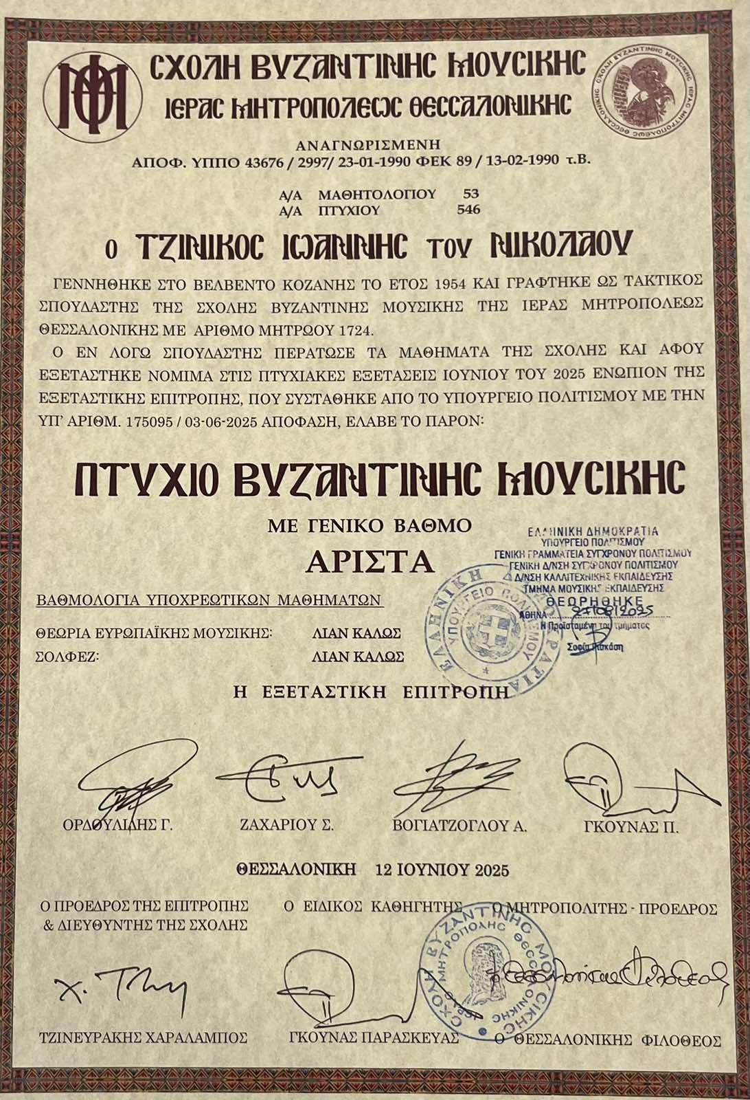 Και πήρε το πτυχίο του, με εξετάσεις, από την αναγνωρισμένη από το κράτος ‘’Σχολή Βυζαντινής Μουσικής της Ιεράς Μητροπόλεως Θεσσαλονίκης’’, ‘’με γενικό βαθμό άριστα’’. Από τον Άγιο Διονύσιο Βελβεντού και εν γένει από το Βελβεντό όλο αναφωνούμε το ‘’Άξιος’’!