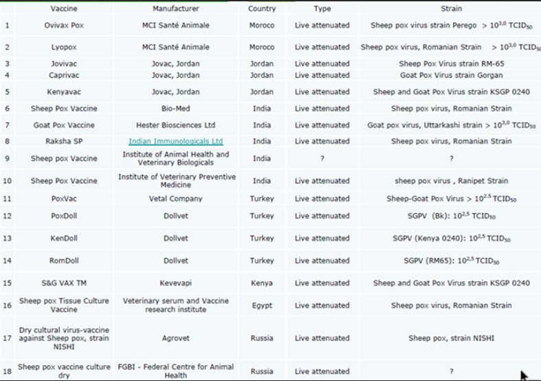 - Η εισαγωγή εμβολίων της ευλογιάς των αιγοπροβάτων είναι παράνομη, καθώς δεν δεν έχει εγκριθεί οποιοδήποτε σχετικό σκεύασμα. Σύμφωνα με τον Νόμο 5184/2025 (ΦΕΚ Α’ 34/06.03.2025), ένα σκεύασμα (όπως το εμβόλιο της ευλογιάς) θεωρείται παράνομο και η διακίνηση του επιφέρει κυρώσεις όταν διατίθεται με οποιονδήποτε τρόπο χωρίς την άδεια κυκλοφορίας που απαιτείται από την κείμενη νομοθεσία. Στη χώρα μας, δεν έχουν εγκριθεί-αδειοδοτηθεί κτηνιατρικά ανοσολογικά σκευάσματα (εμβόλια) για την ευλογιά. Στην εικόνα 3 υπάρχει κατάλογος εμβολίων ευλογιάς που χρησιμοποιούνται σε τρίτες χώρες.