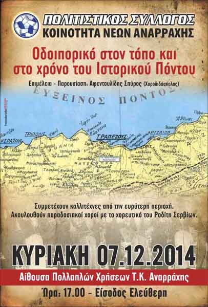 Η Κοινότητα Νέων Αναρράχης διοργανώνει την Κυριακή 7 Δεκεμβρίου 2014 και ώρα 5:00 μ.μ. στην αίθουσα πολλαπλών χρήσεων της Τ.Κ. Αναρράχης εκδήλωση για την παρουσίαση ενός μοναδικού οδοιπορικού στον αλησμόνητο πόντο μία μοναδική παρουσίαση της ιστορίας του πόντου πλαισιωμένη από καλλιτέχνες της ευρύτερης περιοχής και χορευτικά του Συλλόγου Ποντίων Ροδίτη.