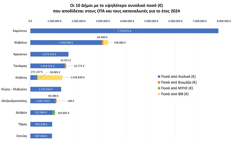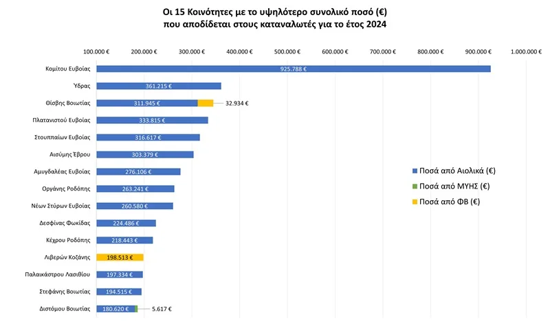 Το 79% αυτών των ποσών, ήτοι πάνω από 32,6 εκατ. ευρώ, προέρχεται από τα αιολικά πάρκα.