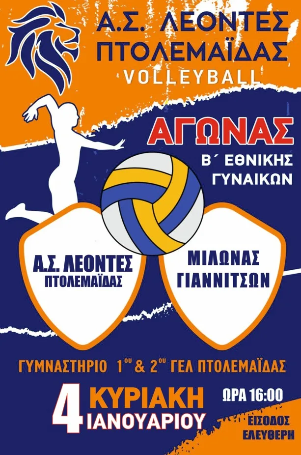 Άλλος ένας αγώνας για τη Β΄ Εθνική γυναικών στο βόλεϊ και την ομάδα ΛΕΟΝΤΕΣ Πτολεμαΐδας απέναντι στον ΜΙΛΩΝΑ Γιαννιτσών θα διεξαχθεί την Κυριακή 4/1 και ώρα 16:00 στο Γυμναστήριο του 1ου & 2ου ΓΕΛ Πτολεμαΐδας. Είσοδος ελεύθερη.