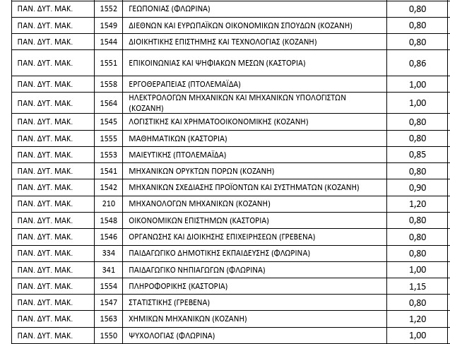 Στο Πανεπιστήμιο Δυτική Μακεδονίας, συντελεστή 0,80 έχουν η Γεωπονία, το Διεθνών Ευρωπαϊκών Οικονομικών Σπουδών, το Λογιστικής, το Μηχανικών Ορυκτών Πόρων, το Μαθηματικό, Οικονομικών Επιστημών, Οργάνωσης και Διοίκησης, Παιδαγωγικό Δημοτικής Εκπαίδευσης και Στατιστικής. Λίγο υψηλότερο συντελεστή στο 0,85 βρίσκεται η Μαιευτική Πτολεμαΐδας, στο 0,86 είναι το τμήμα Επικοινωνίας και ψηφιακών μέσων, στο 0,90 βρίσκονται οι Μηχανικοί Σχεδίασης προϊόντων. Συντελεστή στο 1,00 έχουν η Εργοθεραπεία, οι Ηλεκτρολόγοι Μηχανικοί & Μηχανικοί Υπολογιστών, Παιδαγωγικό Νηπιαγωγών & Ψυχολογίας. Από τους υψηλότερους συντελεστές με 1,15 και 1,20 αντίστοιχα έχουν η Πληροφορική και οι Μηχανολόγοι Μηχανικοί – Χημικοί Μηχανικοί, αντίστοιχα.