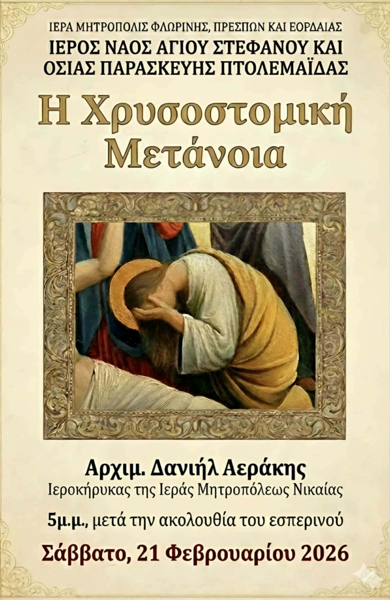Πνευματική εκδήλωση με θέμα «Η Χρυσοστομική Μετάνοια» θα πραγματοποιηθεί το Σάββατο 21 Φεβρουαρίου 2026 στον Ιερό Ναό Αγίου Στεφάνου και Οσίας Παρασκευής Πτολεμαΐδας, με ομιλητή τον Αρχιμανδρίτη Δανιήλ Αεράκη, Ιεροκήρυκα της Ιεράς Μητροπόλεως Νικαίας.