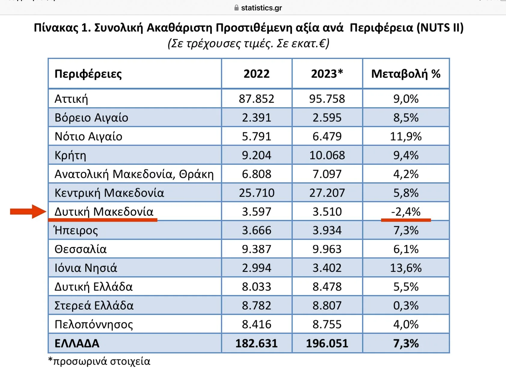 Όπως επισημαίνει, ενώ το σύνολο της χώρας κινείται σε τροχιά ανάκαμψης μετά την ύφεση που προκάλεσε η πανδημία το 2020, η Δυτική Μακεδονία αποτελεί –σύμφωνα με τα στοιχεία– τη μοναδική περιφέρεια που δεν ακολουθεί αυτή την πορεία ανάπτυξης.