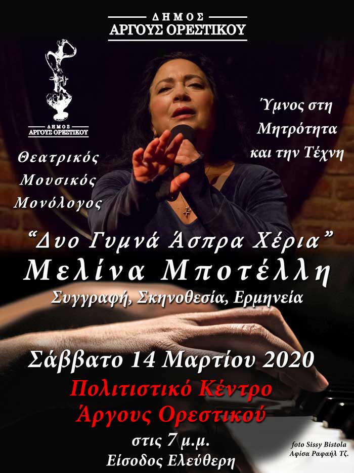 Τον υψηλού επιπέδου και μεγάλης καλλιτεχνικής αξίας θεατρικό-μουσικό μονόλογο ”ΔΥΟ ΓΥΜΝΑ ΑΣΠΡΑ ΧΕΡΙΑ”, παρουσιάζει στο Πολιτιστικό Κέντρο του Άργους Ορεστικού η ηθοποιός και μουσική ερμηνεύτρια Μελίνα Μποτέλλη, με πρωτοβουλία του Δήμου Άργους Ορεστικού.