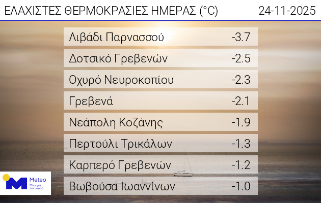 Με τις πρώτες χιονοπτώσεις να έχουν έρθει στη Δυτική Μακεδονία μέσα στο Σαββατοκύριακο, η θερμοκρασία έχει πέσει αισθητά σε πολλές περιοχές. Τη Δευτέρα 24/11 περιοχές της Κοζάνης και των Γρεβενών βρέθηκαν στις χαμηλότερες θερμοκρασίες της ημέρας σύμφωνα με το meteo.gr.