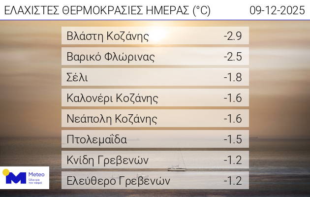 Αρνητικές θερμοκρασίες κατέγραψε σήμερα η Δυτική Μακεδονία, με τη Βλάστη Κοζάνης να σημειώνει τη χαμηλότερη τιμή της ημέρας στους –2,9°C. Βαρικό Φλώρινας, Πτολεμαΐδα, Σέλι και αρκετές ακόμη περιοχές βρέθηκαν επίσης κάτω από το μηδέν, επιβεβαιώνοντας ότι ο χειμώνας κάνει αισθητή την παρουσία του.