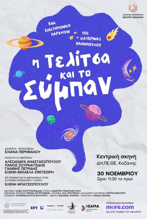 Το Δημοτικό Περιφερειακό Θέατρο Κοζάνης και η Ομάδα Θέαμα που αποτελείται από επαγγελματίες ηθοποιούς με και χωρίς αναπηρία, σας προσκαλούν στην παιδική παράσταση “Η Τελίτσα και το Σύμπαν”, την Κυριακή 30 Νοεμβρίου, στις 11:30 π.μ., στην Αίθουσα Τέχνης.
